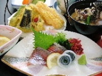 小鉢、玄海の刺身、天ぷら、茶碗蒸、天然おこぜ味噌汁、ごはん、香物